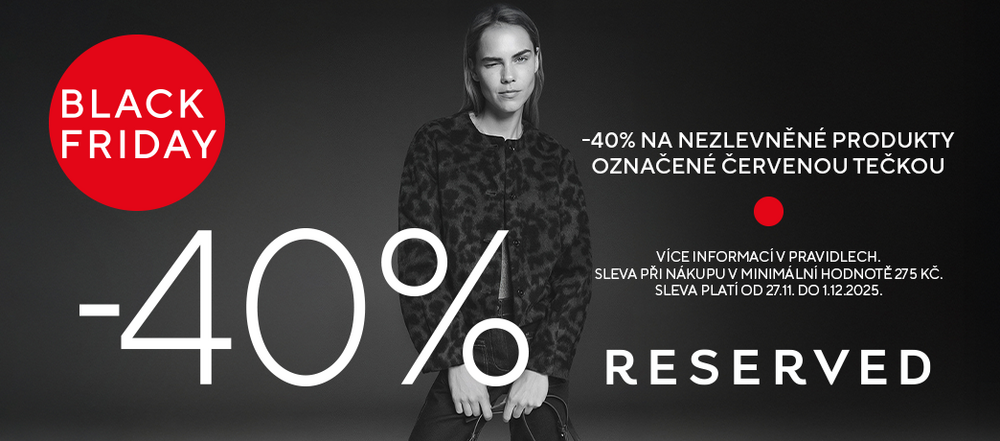 Využijte BLACK FRIDAY na maximum 😉. Přijďte na prodejnu RESERVED a získejte slevu 40% na vybrané modely!!! Platí od 27.11. do 1.12. pouze na prodejnách RESERVED!