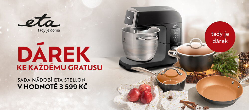 Akce se vztahuje na všechny kuchyňské roboty ETA GRATUS (ETA0028 / ETA0038 / ETA1028 / ETA2038 / ETA2043) zakoupené v termínu 1. 10. - 23. 12. 2025 na e-shopu eta.cz nebo ve značkových prodejnách ETA, nebo do vydání zásob dárku. Registrace je možná do 5. 1. 2026. Více informací na www.eta.cz nebo ve značkových prodejnách ETA.