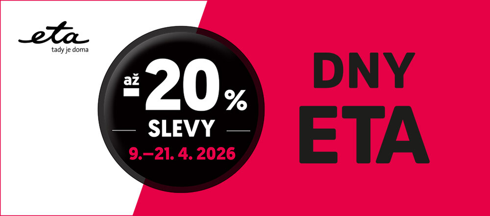 DNY ETA jsou tady! V termínu 9. 4. – 21. 4. 2026 můžete pořídit vybrané malé a velké domácí spotřebiče se slevou až 20 %. Nakupte ve značkových prodejnách ETA a vybavte si domácnost opravdu výhodně.