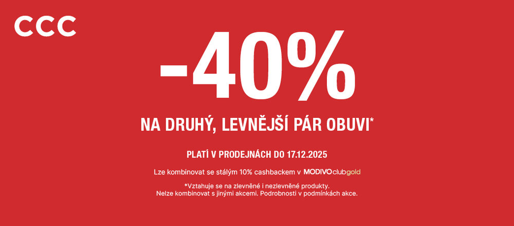 Je čas na nákupy - vyberte si dva páry obuvi a získejte 40% slevu na levnější pár! Známé značky nyní ještě levnější! Akce platí i na zlevněné produkty do 17. prosince v prodejnách CCC!