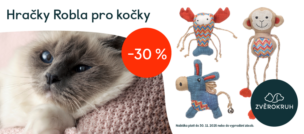 Pro kočky pořídíte zvířátka Robla z režného plátna, plyše a provázků se SLEVOU 30 % nebo dárkový box pamlsků Inaba se servírovací lžící v akci 1 + 1 ZDARMA. Psům i kočkám koupíte po celý listopad krmiva Pro Plan s 15% SLEVOU!