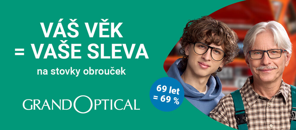 Sleva podle věku se vrací! Stavte se pro nové brýle a ušetřete na stylových obroučkách přesně tolik procent, kolik je Vám let. Sleva se vztahuje na vybrané obruby a platí při nákupu kompletních dioptrických brýlí (obruba + brýlové čočky). Více informací v prodejně GrandOptical nebo na www.grandoptical.cz.