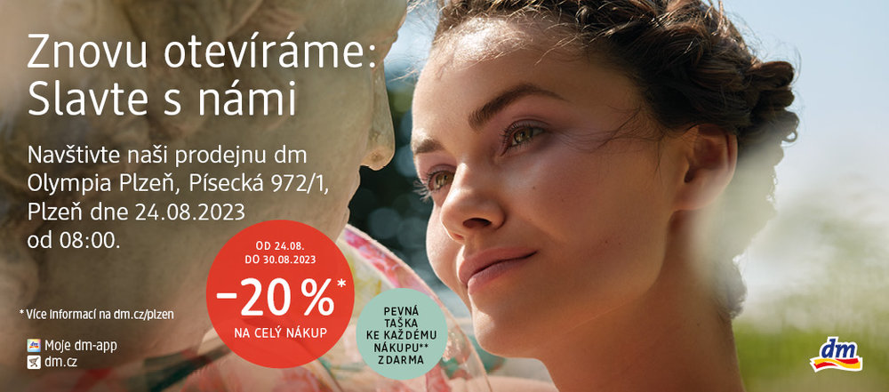 K příležitosti znovuotevření prodejny dm v Olympii Plzeň, Písecká 972/1, Plzeň jsme si pro vás od 24.08. do 30.08.2023připravili slevu 20 %* na celý váš nákup. Aby se vám nákup pohodlněji nesl, obdržíte 24.08. a 25.08.2023 i tašku k nákupu zdarma*.